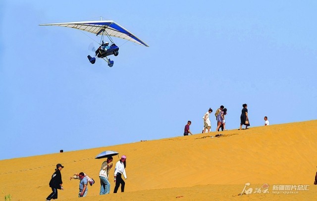 近日,一架滑翔机飞过尉犁县罗布村景区的沙山空。近年来,尉犁县以服务游客、方便游客、提升游客体验为目标,增加露营地、水上摩托艇、滑翔机体验等项目,以优质的服务迎接四面八方的游客。□汪志鹏摄