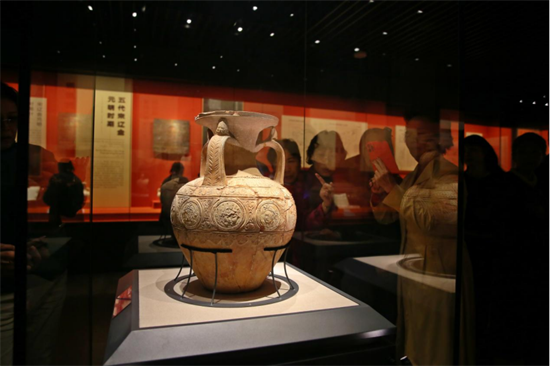 观众观看喀什博物馆展出的北朝三耳浮雕陶罐摄影作品/李·