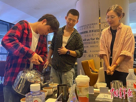 6月26日,在“全民学咖啡”培训班的课堂上,SeekSeeking咖啡馆主理人陈枭龙(中)指导学员冲煮咖啡。一位学员(左)的咖啡馆前一天刚开始营业,除了学习咖啡冲煮知识和手法,他也向陈枭龙请教咖啡馆的创业和经营经验。中青报·中青网记者谭雅丽拍摄
