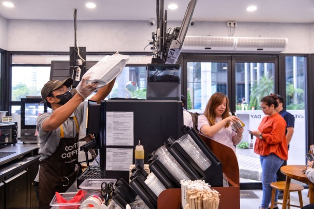2024年11月21日,在印度尼西亚雅加达一家库迪咖啡门店,工作人员在店内工作。新华社记者徐钦摄