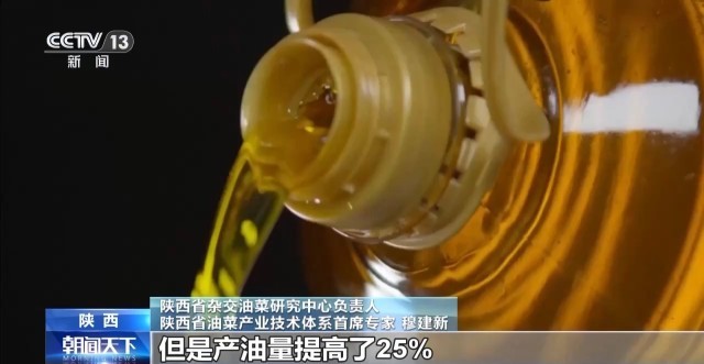 陕西省杂交油菜研究中心负责人 陕西省油菜产业技术体系首席专家 穆建新:我们创制出了含油量66%的种质资源,目前是全世界最高的。土地面积不变,但是产油量提高了25%,那我们就是相当于多种了25%的油菜。通过杂交育种技术,保障食用油供给安全。