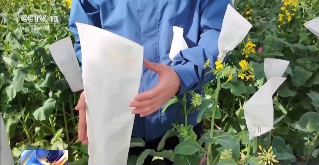 陕西省杂交油菜研究中心育种研究室主任 副研究员 关周博:这叫人工辅助授粉。无论是油菜“戴帽”还是“穿衣”,其实是育种科研的关键一环——套袋。把袋子套上之后,给它穿上这个“小衣服”,防止外边的花粉串粉。